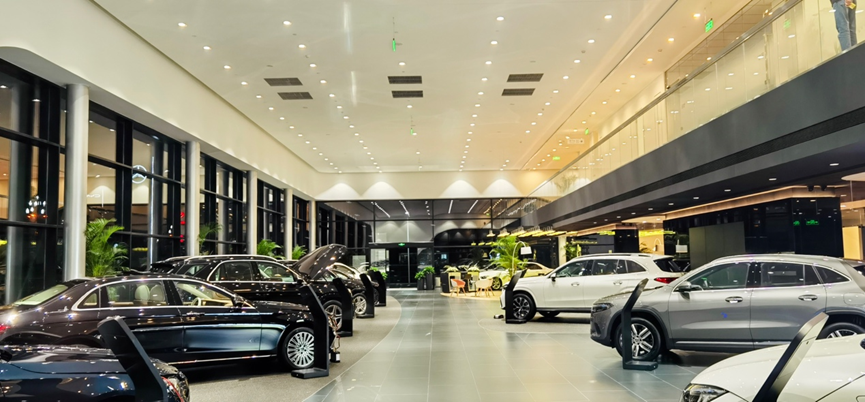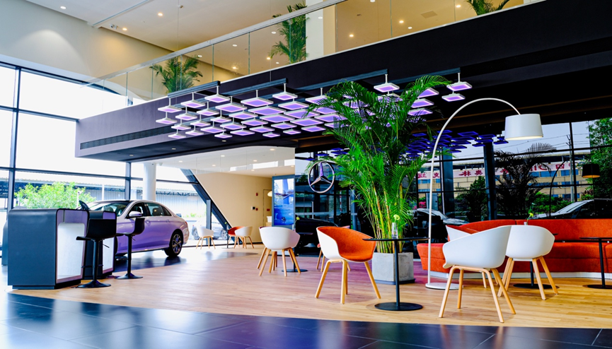 展厅上方多色变换的星辰顶灯层次分明与奔驰车内64色氛围灯如出一辙。它似极光、似琴键、似跳跃,颜色循环变化,无论白天还是夜晚,都是一道亮丽的风景。