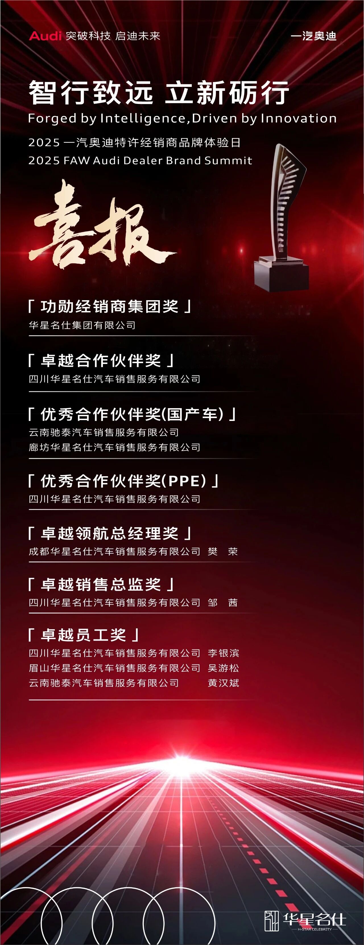 未来,华星人将怀揣数度荣获功勋的信念与底气,破荆棘、向曙光,与全体奥迪车主同心同行,共赴新程、再续华章!